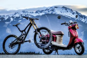 Towing a mountain bike to the trails… with a scooter
