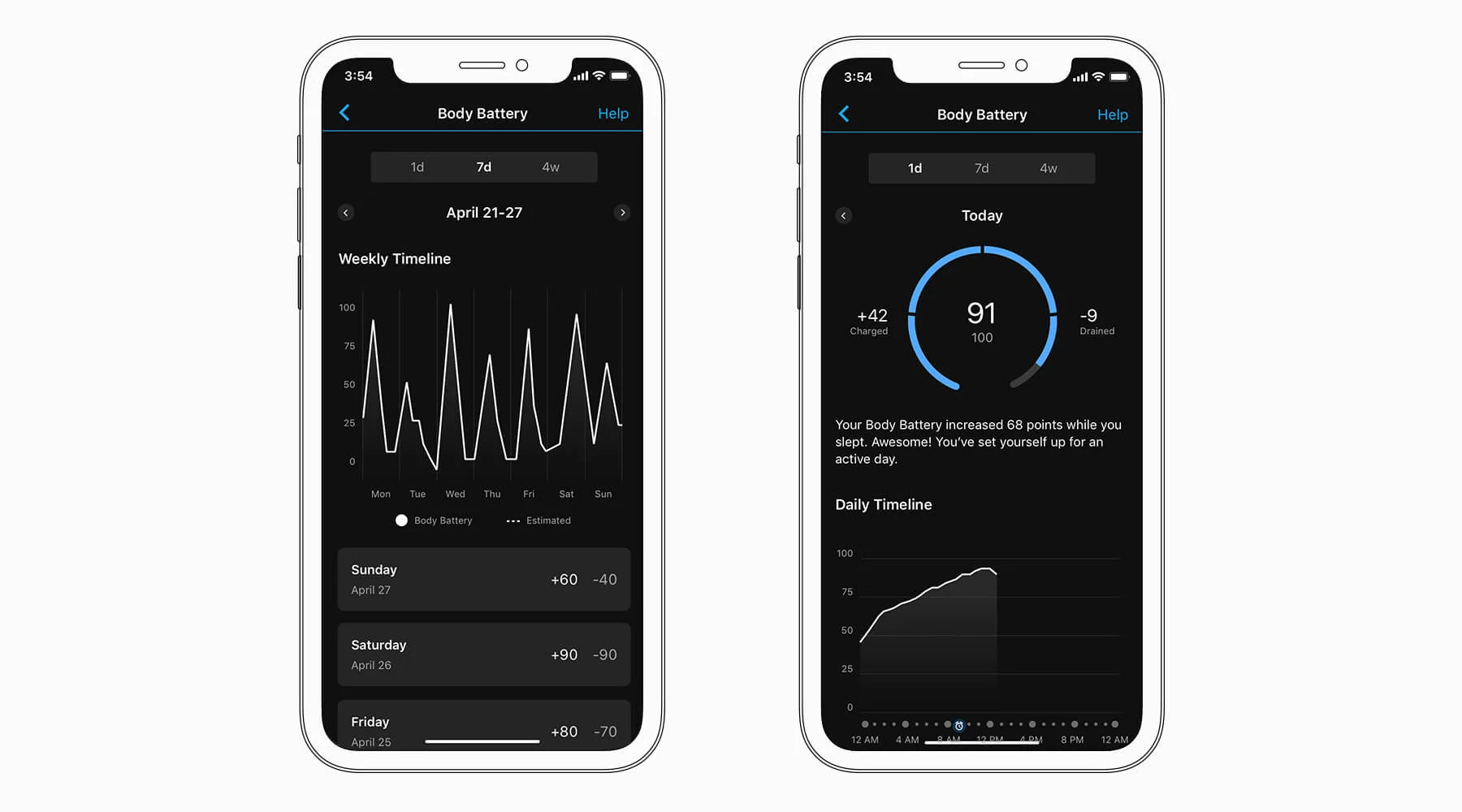 Worst night of sleep per week: And since Body Batteries tend to get lowest on Saturday nights, you’re also getting your worst sleep on Saturday nights into Sunday mornings, with an average sleep score of 68.