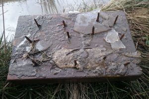 Homemade nailed-board stinger device found submerged in puddle on West Yorkshire bridleway.