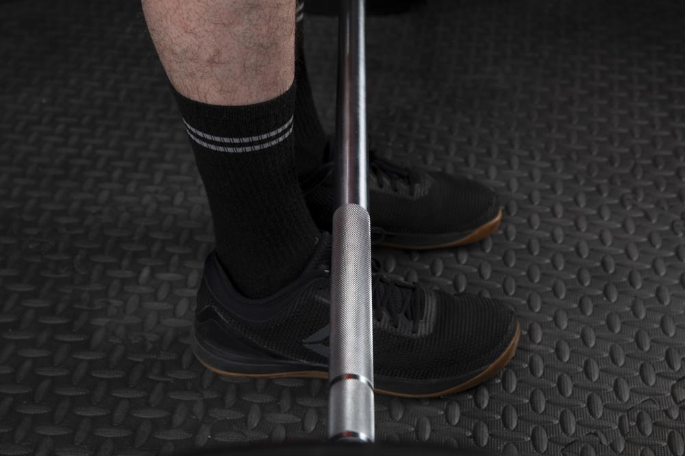 Approach the loaded barbell and place the bar directly over your mid-foot. Stand up straight with your feet directly under your hips, feet pointing forward. The bar should be about an inch away from your shins. To ensure that the bar is at the correct height, use full-size 20in diameter Olympic weight plates.