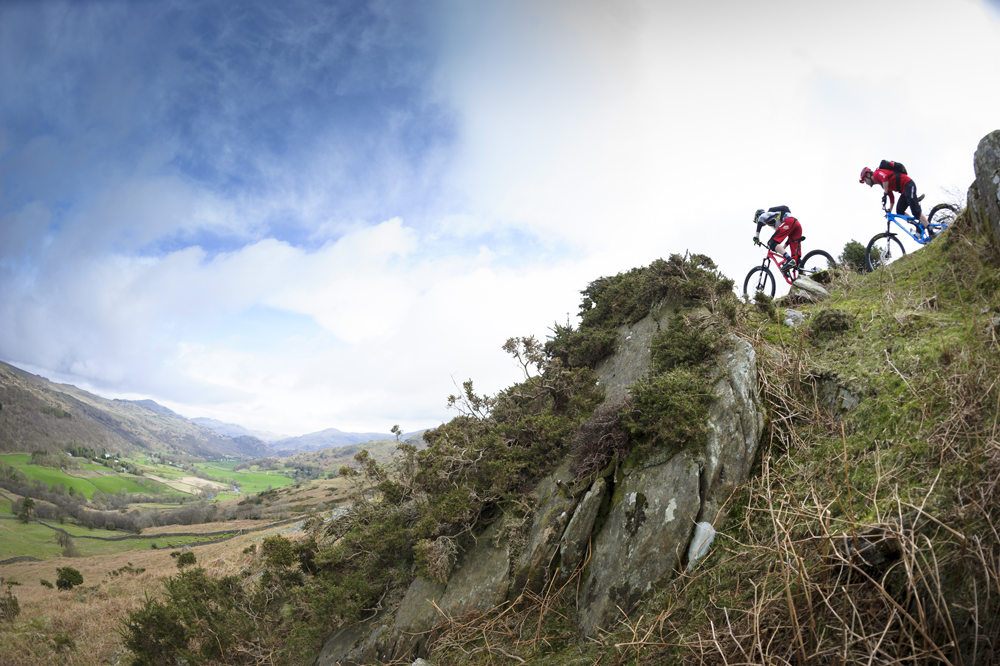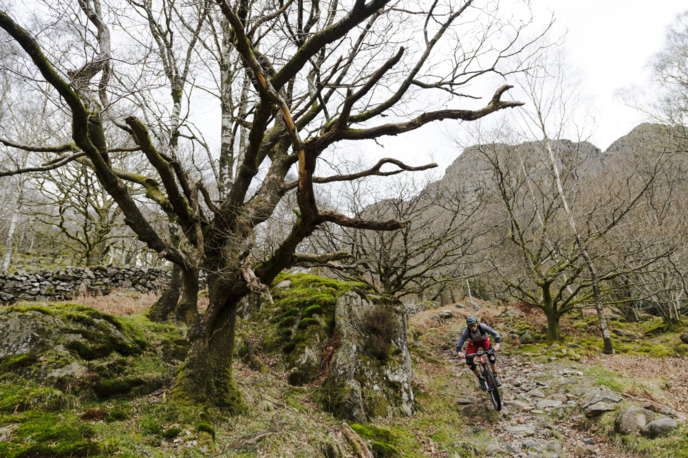 Having successfully navigated our way across the Fell we’re onto the more easily navigable Park Head Road. From here we’re treated to a view straight into the heart of the Lakeland Fells and to an extended descent down to Seathwaite. Rocky, loose, prolonged and plenty quick it’s a perfect example of the type of bridleway you expect in this part of the Lakes. If your eyes aren’t watering and your wrists aren’t a little sore at the bottom you’ve been holding onto the brakes too much. After the slightly vague start to the ride I feel I’ve probably redeemed myself with Alex and Rafi – just in time to ruin it all with a road climb.