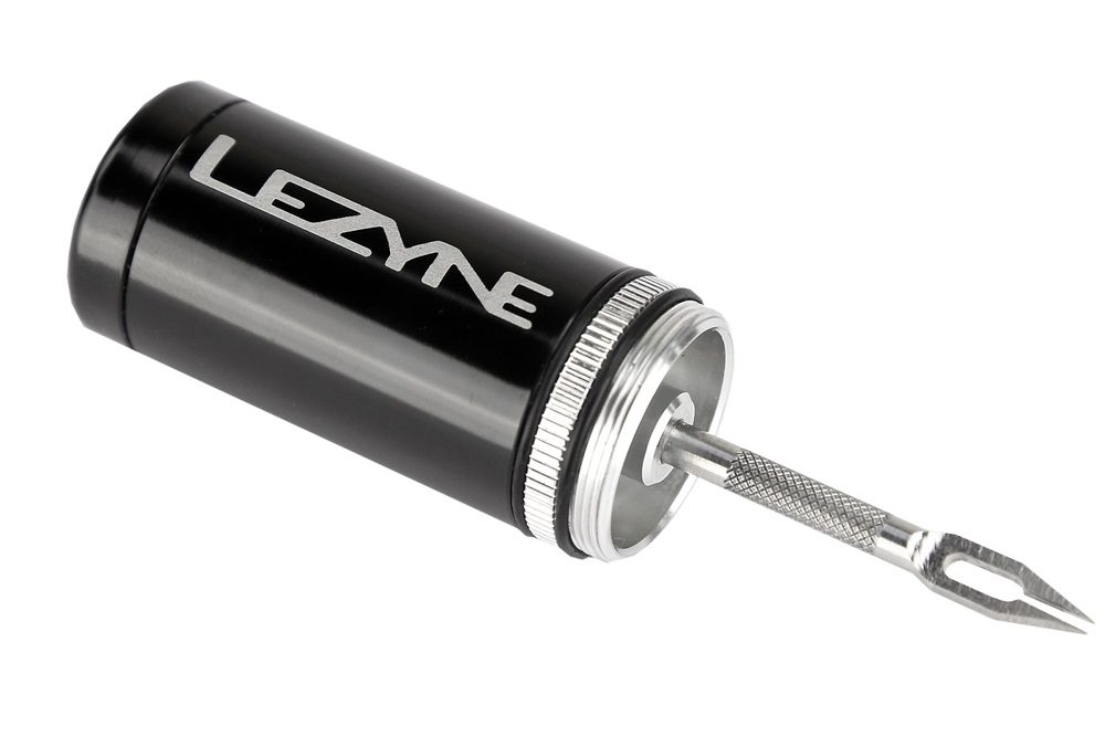 A compact tubeless repair kit with machined aluminium storage tube that doubles as the handle. Combined tyre reamer and insertion tool. Includes five tyre plugs.