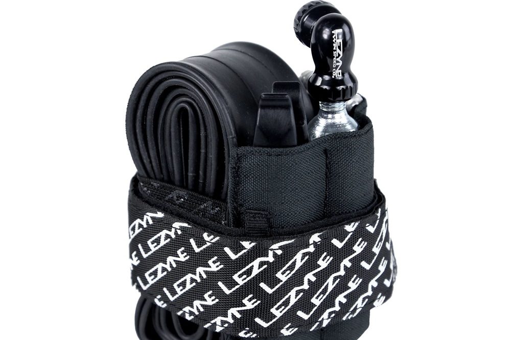 Modern frame strap that quickly and securely mounts to frame or seat post. Three labelled compartments keeps gear and tools organised and secure. Perfect for carrying tyre repair items. Durable, high quality materials including polyester, Neoprene, and rubberised elastics for added grip without damaging paintwork. Holds up to one 25g CO2 cartridge, a mountain bike inner tube, plus a small multi-tool and tyre levers. Tools not included.