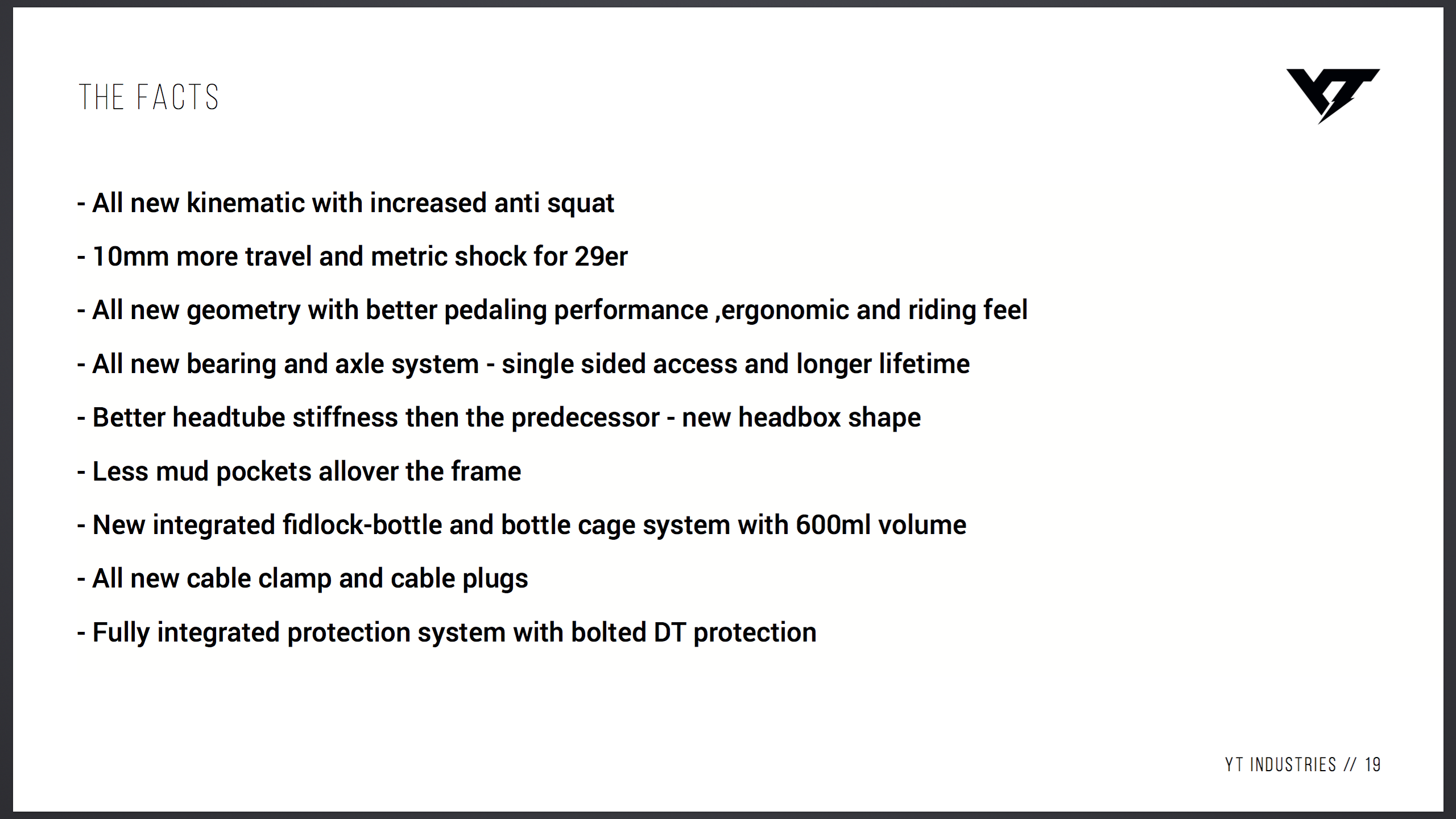 The new Headbox design increases the stiffness of the steerer tube for an even more direct feel at the handlebars. Technical features like the internal cable routing, the double-sealed bearings or the integrated frame protection underline our commitment to making high-end bikes and help increase JEFFSY’s service life while also contributing to the clean looks and sleek silhouette that undoubtedly make it a YT.
