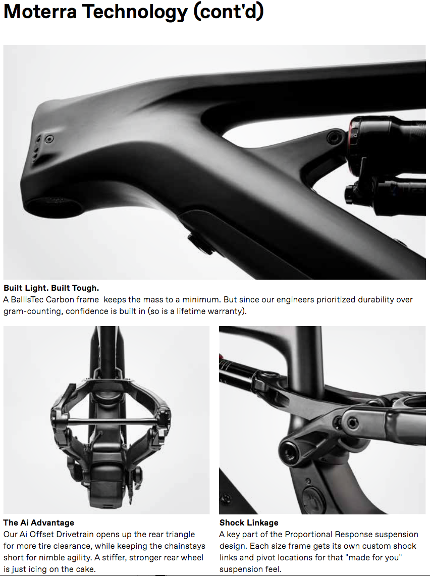 Moterra offers more serious all-mountain capability, with 160mm of terrain-swallowing travel front and rear; big forks, and beefier component specs. It runs on 29” wheels for all sizes except Small, which switches to 27.5” for a better fit for smaller riders. While it shines on the rowdier trails, the Moterra displays incredible poise on mellower terrain as well, making it easy for riders to roll with more travel and more capability than they otherwise would.