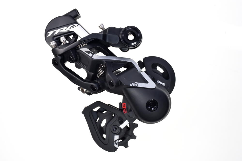 Better known for its brakes, the TRP drivetrain has been developed with the help of Aaron Gwin and his mechanic, John Hall. As you may have guessed from the name, this is a downhill-specific drivetrain with seven gears, but it’s safe to assume that TRP is using this as a basis for a wide-range trail/enduro groupset, as the DH market is so tiny. The shifter body is carbon, with dual thumb paddles and a ‘linear release action’ to ‘closely mimic thumb movement’, although this may also be to do with working around current shifter patents. At the other end, the short cage derailleur boasts an adjustable ratchet clutch to keep the chain secure, and the ‘Hall Lock’, that stops the b-knuckle (at the mech hanger) rotating to reduce noise.