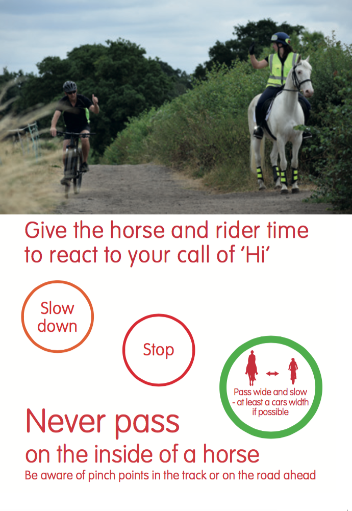 Horses can react quickly when startled, so the two charities are encouraging cyclists to drop their pace and call out a greeting, giving the horse and rider time to react before overtaking wide and slow. By alerting the rider and horse to their presence, cyclists run less risk of the horse reacting, and reduce the risk of injury – not just to the rider and their horse, but also themselves.