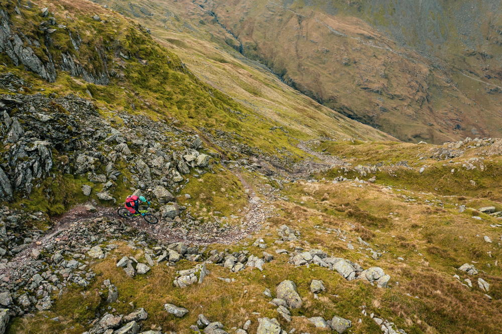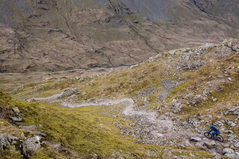 Loose scree slithers down the hillside below my feet. Still air pierced by scattering of slates. The riding is slow speed and of surgical precision. Wheels placed in precise planned positions to navigate the tight turns. Good traction exists between soft compound rubber and only those rocks embedded in the earth – trust a loose one at your peril. Speed gathers as the turns widen, small scree is scattered in the riders wake as he completes the couloir.