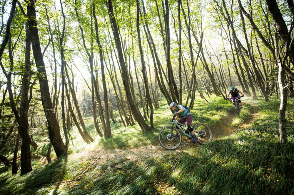 For a relatively small country, Slovenia more than makes up for it in variety; after traversing exposure-riddled scree, Juliana ambassadors Rachael and Julia drop out of the rocky dark ominous woods, and into this patch of bright heavenly singletrack with the perfect opportunity to drop a foot and kick up some dust