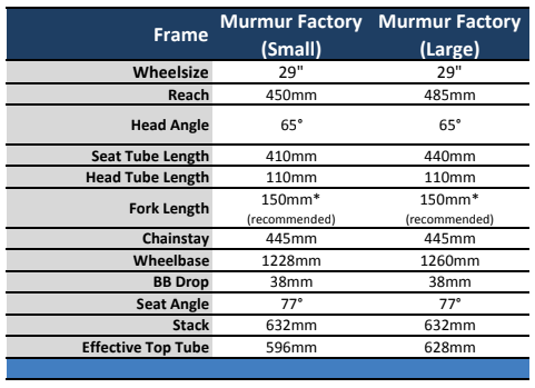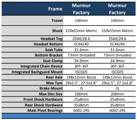 The Starling Murmur Factory Edition is built around 29” wheels with 140mm rear travel with room for disc rotors up to 200mm and 2.5” tyre clearance. The frames will fit metric rear shocks and 148 x 12mm Boost rear hub spacings.