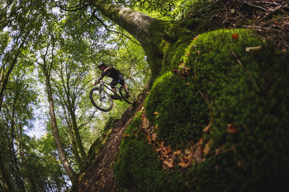 The woodland is starting the fade from summer green to autumn yellow. Leaves are falling and slowly covering up the trails, some of which look like they were vague to start with. Tell tale ruts and berms dot the hillside and it’s our job to piece them together as we ride. Burf isn’t afraid to get a bit loose and carve the bike from one edge of the tyres to the other throwing up leaves and dirt as he changes direction. The geometry that was originally designed to work in the Highlands has no issues working here. That first Ranger had 26inch wheels but is now available to fit 27.5 or 29inch wheels. Burf’s preference is for the middle wheel size – in his view it’s more of an all rounder and looking at the way he rides it makes the most sense. Jump, hop, manual, slide – speed and maneuverability combined.