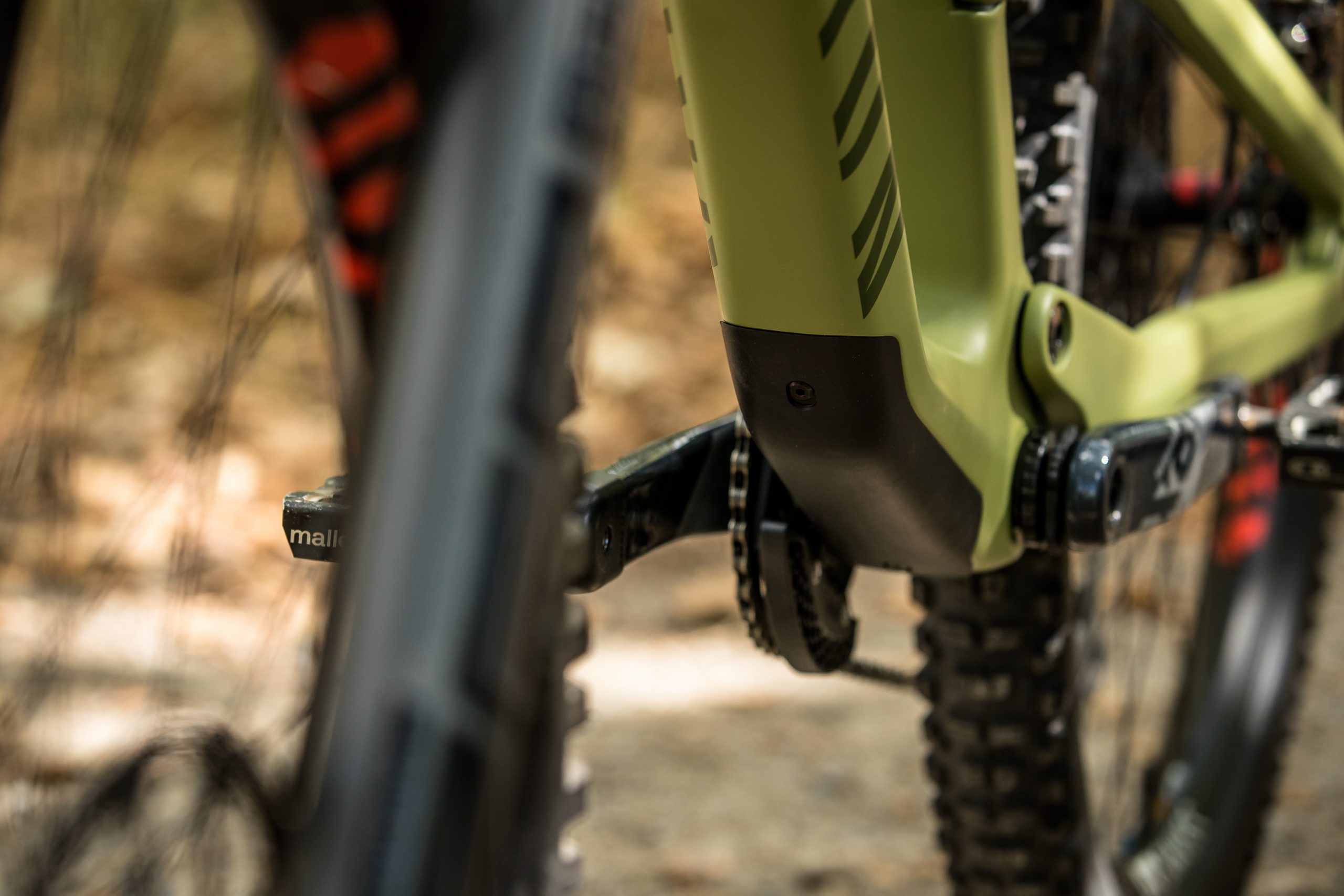 “Integrated rubber downtube protector shields the frame from errant rocks and crashes and a moulded seatstay protector does the same. A proprietary chainstay protector with special ridges protects the rest of the rear triangle while also dampening any chain slap.”