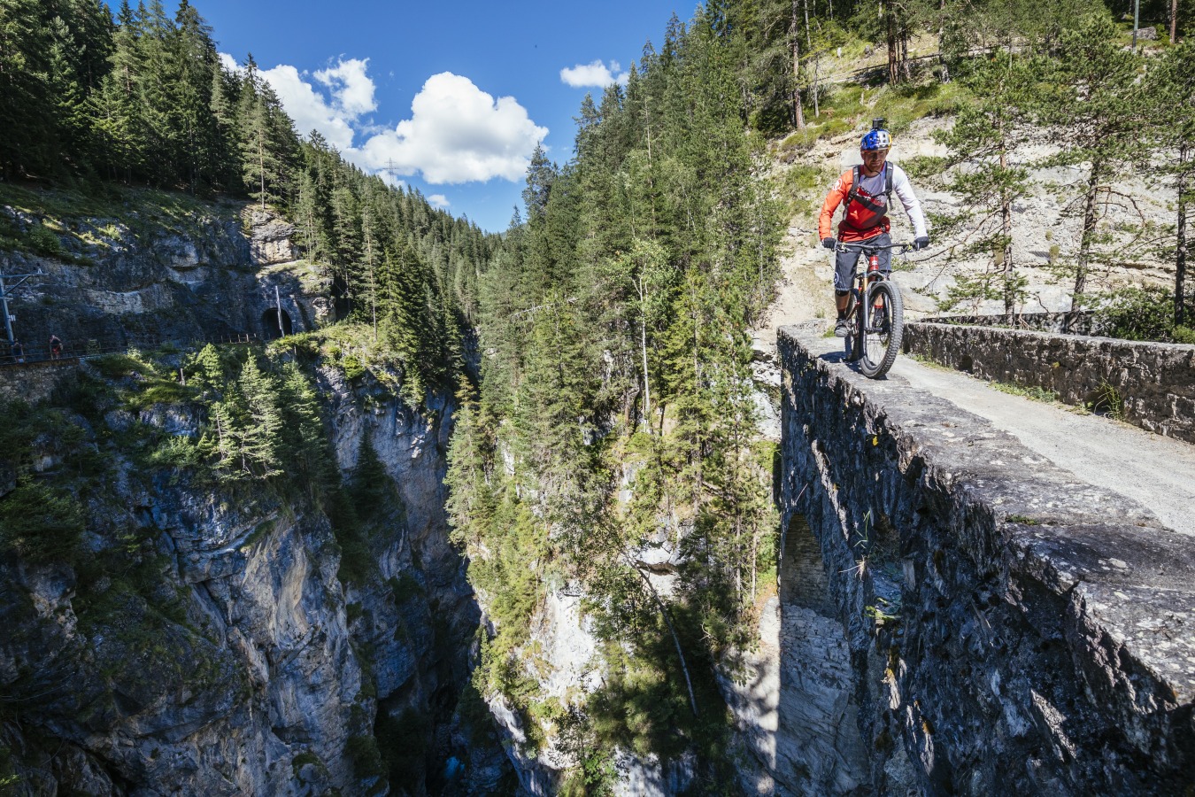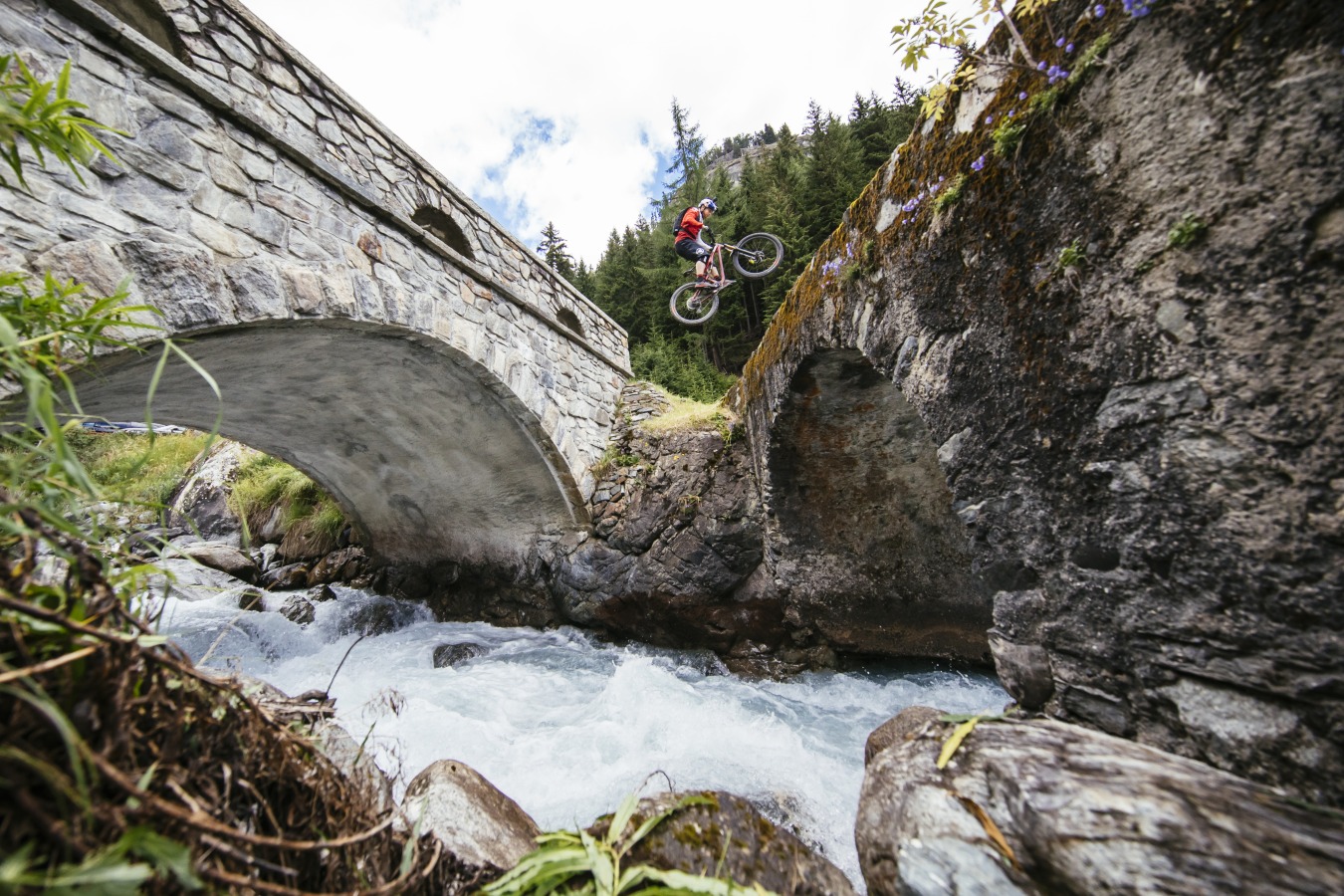“The small Pra da Punt bridge spans the Tasnan mountain stream near the rustic mountain village of Ardez in a rather unspectacular manner. But for Danny MacAskill, it is the perfect playground. In the «Home of Trails» video, the Scottish star cannot resist to leave the trail and jump from the new to the old stone bridge. Below him: a rough mountain stream. Next to him: an impressed Claudio Caluori.