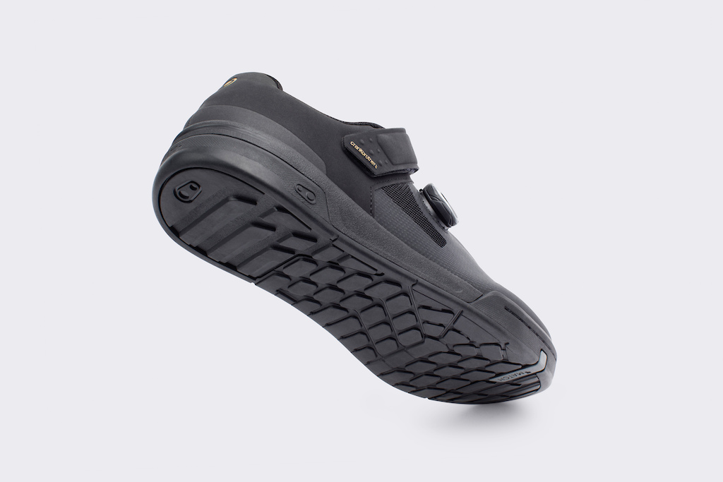 The Stamp is for flat pedal riders and has a large block sole tread pattern in the pedal contact area. Crankbrothers have optimized this to aid traction pin integration,