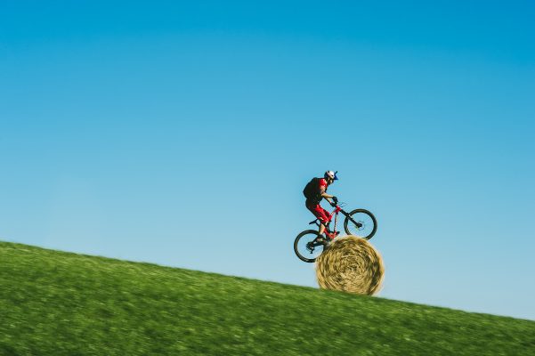 “The most difficult part by far was trying to deal with the way the bike reacted while on top. Because the bale rolled away from me the wheels were spinning backward. Everything you do, like turning the handlebars had the opposite effect. I would pull the brakes and get catapulted forward. So, the idea was to try to hang off the back of the bale, with a slight amount of pressure on the brake. Occasionally I would find myself teetering in perfect balance on the bale, which I have to tell you was absolutely terrifying. It was like being on a bronco during a rodeo.