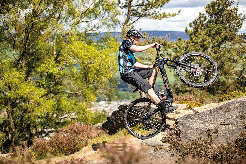 One area where it’s possible to approach obstacles differently with an e-bike is climbing up big steps or ledges. This is a more advanced move and you need to be pretty confident in your wheelies to start with. This technique is brutal, but effective – to power straight up steps or vertical rock and roots continuously on the back wheel.