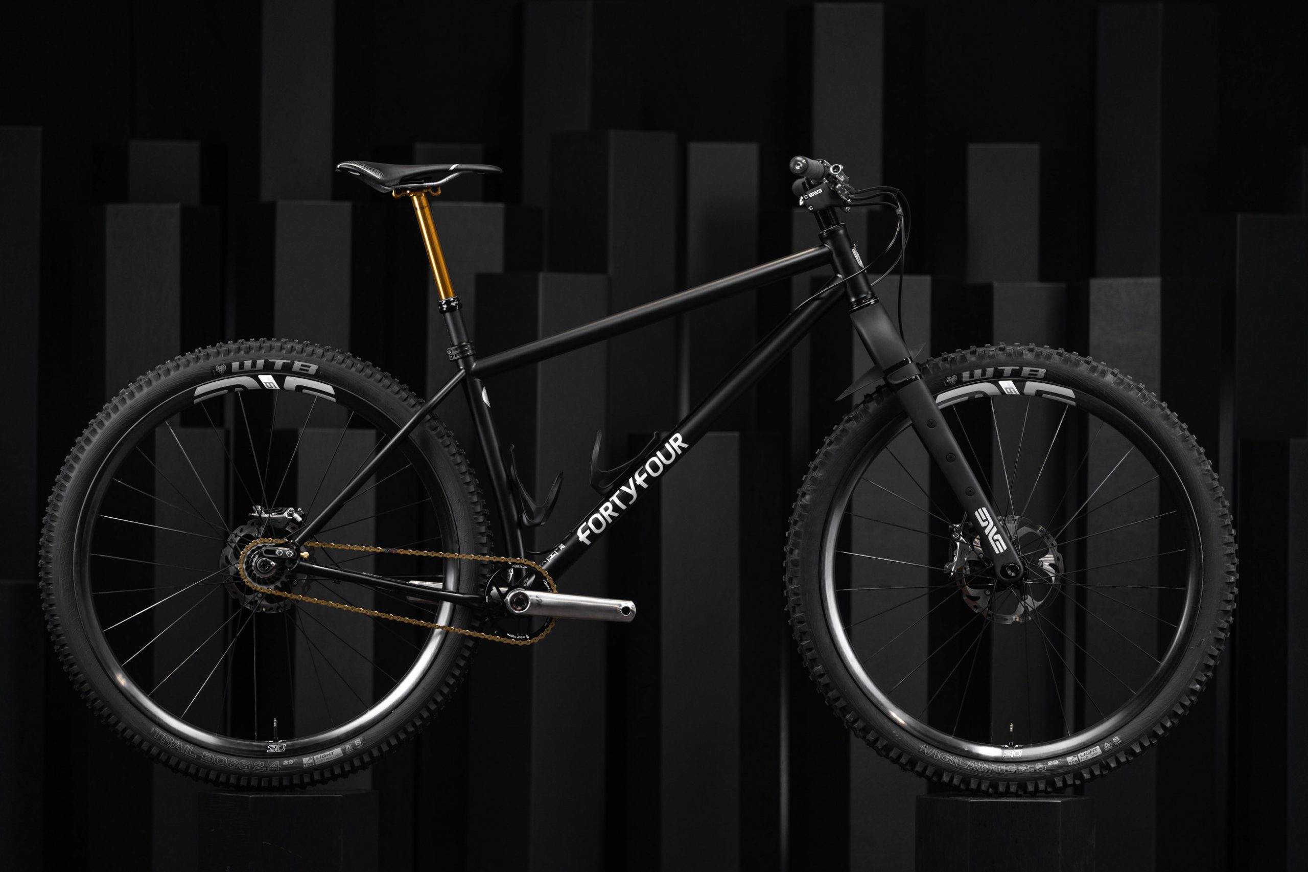 44 Bikes comes in with a prototype for what will be their first stock bike option after two seasons of development. It’s designed with options to run it single speed or with gears. Chainstays, seat stays, and seat tubes are all shaped in-house using Reynolds 853 tubing. The finishing build includes ENVE’s M6 Bar, Mountain Fork, and M630 wheels.