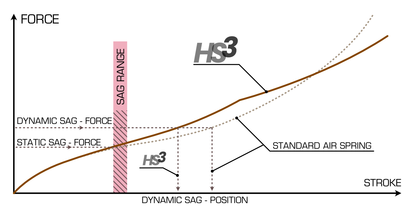 The dynamic sag point is kind of where you begin to enter the mid-stroke section of the fork travel. Typically it is tricky to get a suspension fork to give out ‘The Holy Trinity’ of characteristics: inital ‘off-the-top’ suppleness, mid-stroke support and a useable full-travel (no harsh bottoming, nor overly extreme ramp-up).