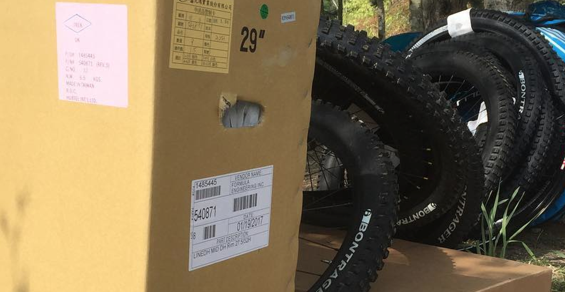 The first pic looks like it may contain a 29er Commençal downhill bike (a Furious 29er?). The second pic is a bit more obscure. Although the box clearly has ‘29″‘ stamped on it the actual product label refers to 27.5″ rims. Here’s our CSI-style zoomed-in pic for your inspection…