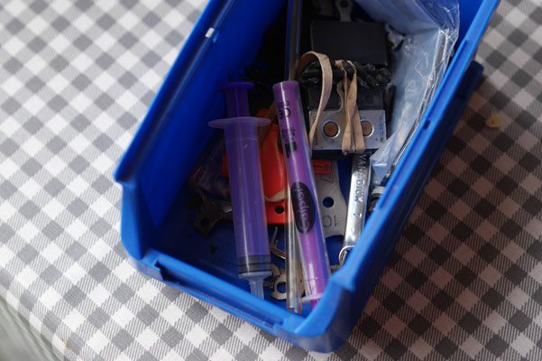 Pictured here are nitrile gloves from B&Q but you can just use a pair of washing up gloves. Use them for what? Protecting your hands when working with noxious brake fluid. Giving you extra grip and purchase when servicing rear shock air cans. Keeping in your pack as emergency glove liners when the weather’s trying to kill you. And plenty more uses.