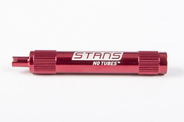 Removing the vale core allows you to top up with fresh sealant and also clean any congealed gunk off the core itself. To do this properly you’ll need a valve core remover, like this red devil from Stans NoTubes. It can also tighten Schrader valve cores in most rear shocks.