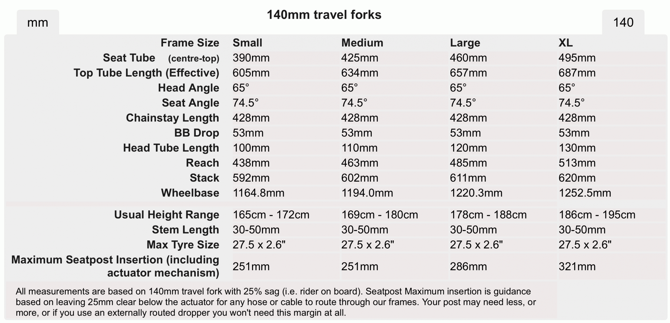 Beyond the lower bottom bracket, the geometry charts tally a familiar set of numbers for anyone with recent experience of Cotic’s 27.5in BFe. Although it remains rated for forks up to 160mm in travel, the recommended configuration is 140mm up front, delivering a 65° head angle and 485mm of reach on a size L frame.
