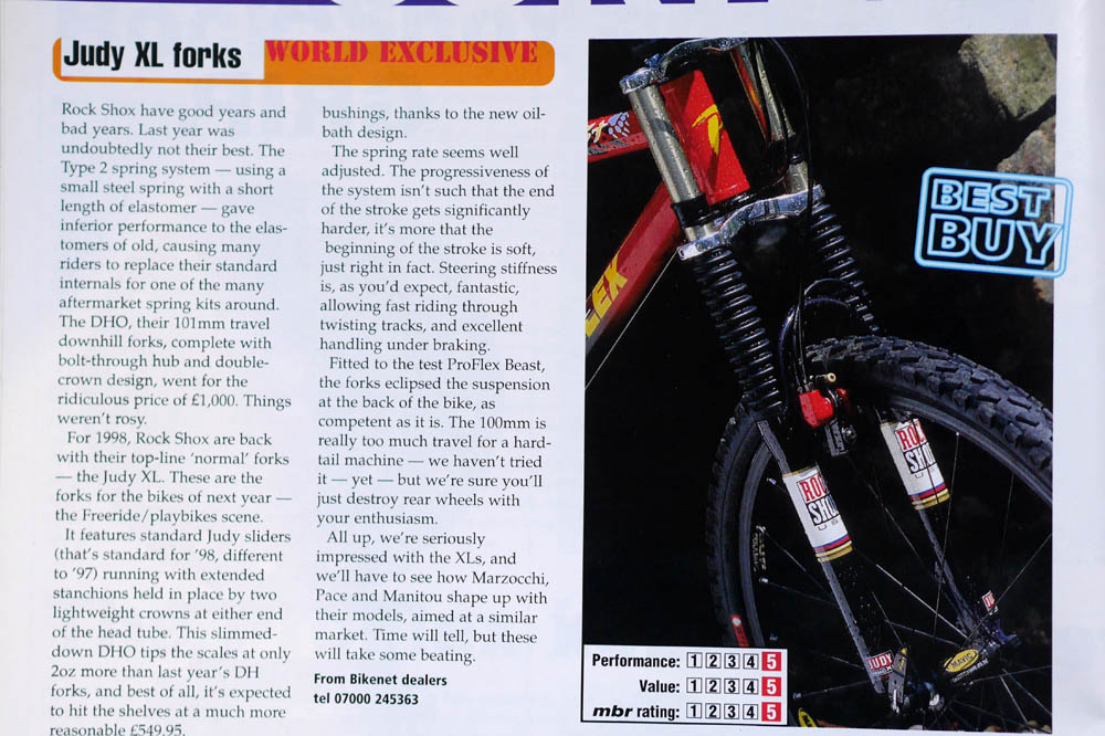 The Judy XL was actually pitched as being a more affordable version of earlier bonkersly expensive suspension forks from RockShox aimed at pseudo-DH riders and aggressive trail riders (this was before the era of ‘All Mountain’ and so on). 100mm of sweet elastomer travel and a QR axle. They do still look fantastic though.