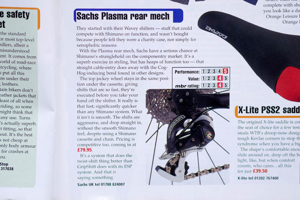 Some of you whipper snappers may not even know of the brand Sachs. Basically Sachs morphed into SRAM. This Plasma rear mech was actually something of mild game changer. Purely by its cunning repositioning of the cable entry point that vastly reduced cable bind or drag, the Plasma was an instant success and many UK riders made the switch from Shimano.