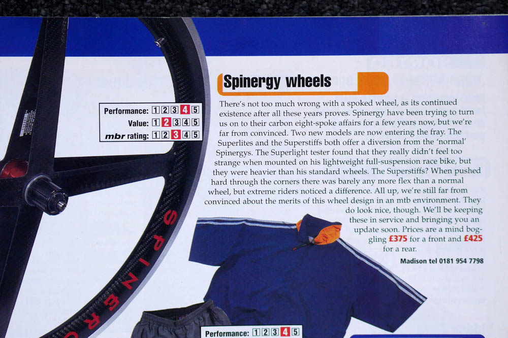 Carbon wheels that promise the world and cost the earth. Some things never change. Except the ditching of mega-spoke wheel designs like Spinergy. Can you imagine what it was like rumbling your way down the trails with these things under you, complete with several branches and squirrels stuck in there no doubt. Kinda rad in a way.