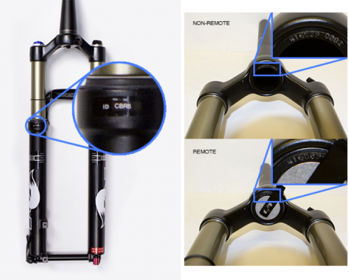 • Locate the fork’s ID code on the backside of its left lower leg. • Enter the ID code in the interactive form at http://ridefox.com/recall • You will then be guided through upgrade process step-by-step • The next step, if your fork is identified as possibly needing an upgrade, will be to locate the serial number stamped on the underside of the crown. You will need to remove your front wheel to get this information. You may also need to clean this area depending on your bike’s use. If it’s a remote fork, you’ll need to remove the cable hanger to see the entire serial number. Please also note that the numbers 0, 3, and, 8 can look very similar.