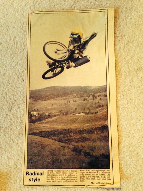 Ironically this picture was my first ever photo shoot. A guy from my local Kamloops newspaper called me and said, “I hear you have the best tabletop in town. Can we take some pics of you doing it?” Away we went and it made the cover. Who knew it would launch my career. My First BMX sponsorship was with GT and this was a chrome GT from around 1984 – GT frame, fork, bars and seat post, with Profile cranks and Shimano DX pedals, Oakley grips, and Tioga Comp 3 Tires. I don’t remember the rest of the parts, but it was the coolest bike I had ever owned at that point.