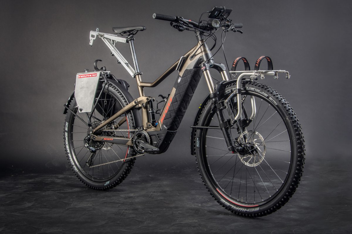 Scott Sk-eRide combines a Shimano STEPS E8000 motor, Schwalbe Ice Spiker Pro studded tyres and Speedguide 95 skis and loads of luggage straps.