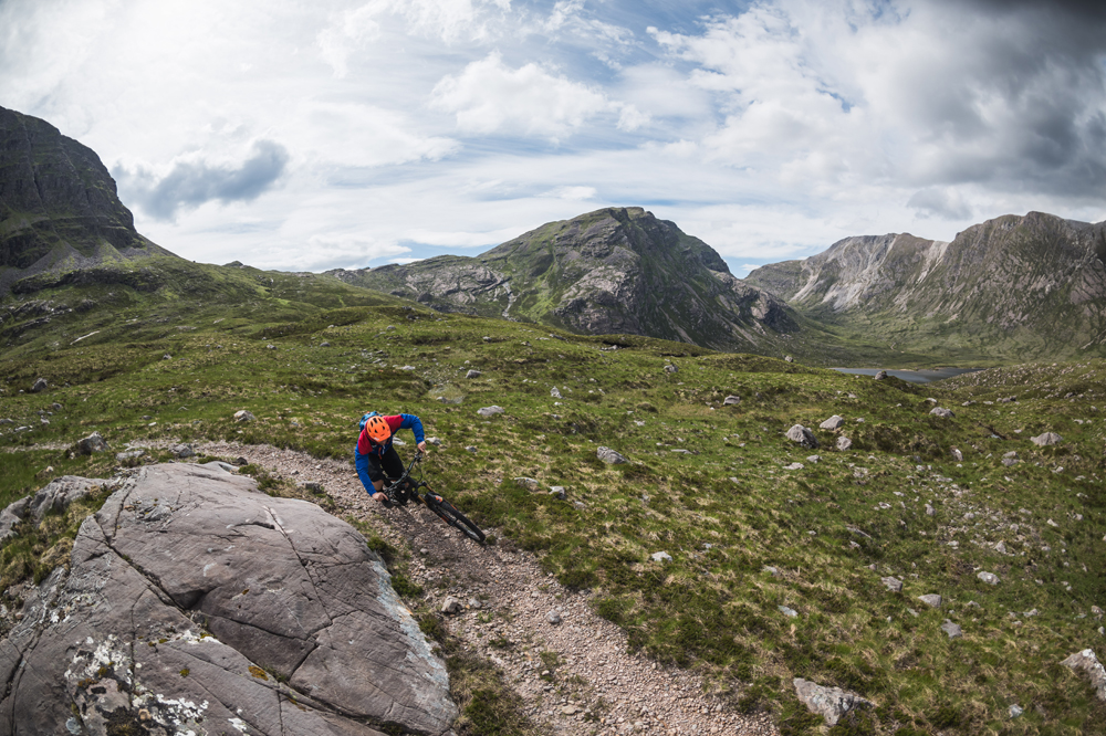 Out of the woods and the landscape is our own, patches of sunlight pass across our two tiny figures dwarfed by the scenery, it’s a mix of riding and pushing, but seeing such good trail conditions, I can already tell any hike-a-bike is going to be worth it! The ground is hard packed, with a mix of eroded Torridonian sandstone that creates a hard but well drained surface, and moonscape slabs of exposed rock, all just begging to be ridden.