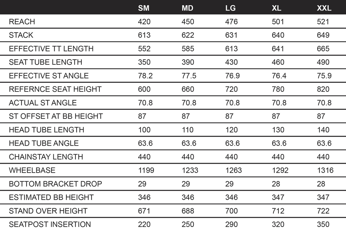 63.5° head angle, approx 77° seat angle. Lengthened chain stays. More tyre clearance. Short seat tube lengths with lengthy dropper post insertion. Small size gets 150mm dropper, Medium 180mm, and L-XXL get 210mm.