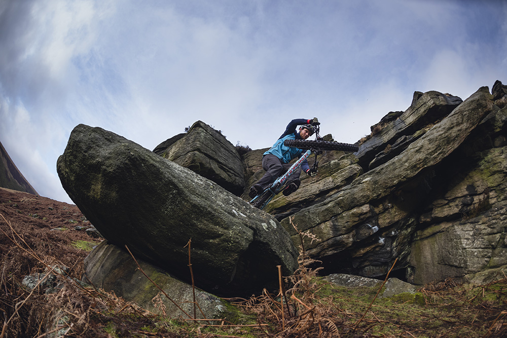 As with trying anything new or difficult the hardest part is starting. Peering over the edge of a gritstone boulder Matt seems confident it’ll go. In theory this is supposed to be a nice warm up into some trials style riding, in practice it feels a little scary. The move boils down to a short run up, a yank of the bars to get onto the boulder, a moment to steady yourself before another yank of the bars to drop off the other side. The problem for me is speed. Going slow feels like it will be easier and safer but the slower I go the more it relies on having perfect technique. I’m a long way from that so I add some speed to act as a crutch. Doing so requires a dose of brave pills and some mild bullying from Dan and Matt but it works. Speed is my friend.