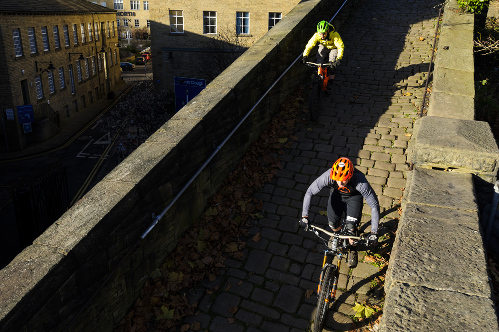 A steep cobbled climb out of town takes us efficiently if not easily to the top of the hill, through an estate and down a farm track before funneling us through a non-contemporary handlebar width friendly path between drystone walls. From here we get a view down onto Halifax and a better feel for where we’ve ridden today and what we’ve not managed to get to. Linking up the wooded sections is straightforward enough, there are roads everywhere, but linking them up to make the most of all the ginnels, staircases, ramps and other street furniture is the key – to make every bit count, whether on dirt or on concrete.