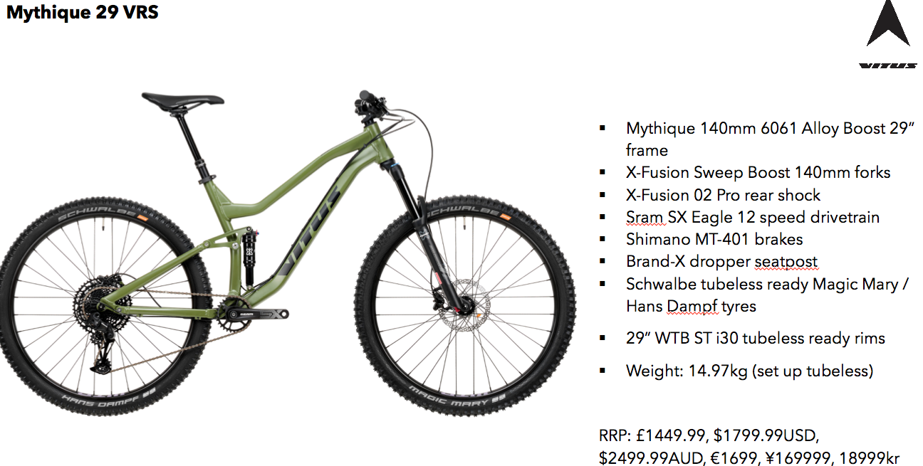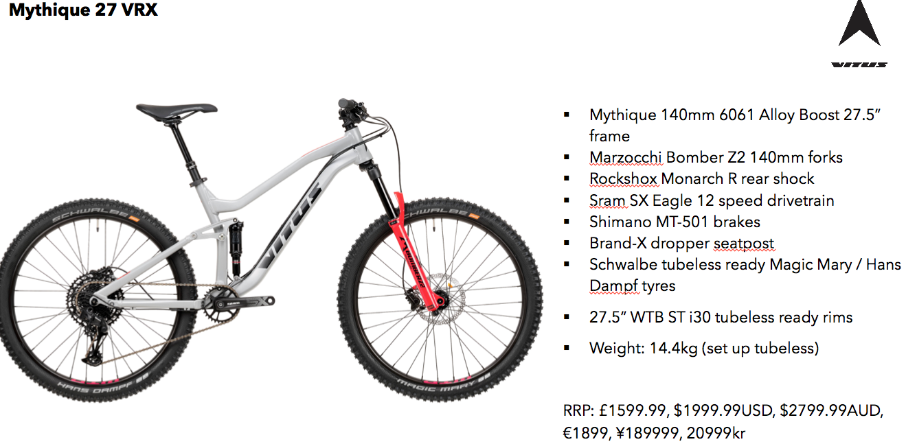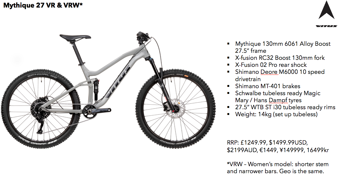 New Vitus Mythique is based around a Horst-link 4 bar suspension design – both wheel size options – with prices starting from £1249.99 UK RRP.