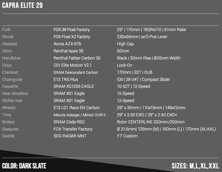 The CAPRA Elite 29 is the new high-end version of YT’s most popular rig. Available in the frame sizes M-XXL. Carbon frame accompanied by FOX 38 Float Factory fork with 170mm of travel. The new FOX Float X2 Factory air shock with 170mm of rear travel. Boasts new SRAM X01 Eagle 52 drivetrain. Includes an improved tyre spec with MAXXIS Assegai EXO up front and MAXXIS Minion DHRII EXO+ in the back. All rounded off with a Renthal Fatbar Carbon 35 handlebar and E13 LG1 Race EN Carbon wheels.