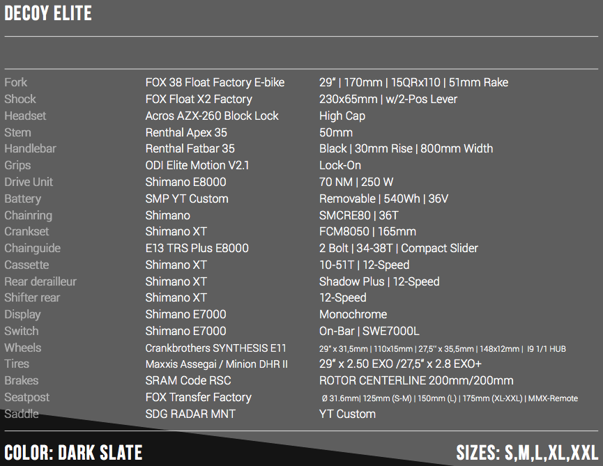 High-end variation of the DECOY. The DECOY Elite is an E-MTB and the carbon mullet-build comes in frame sizes S to XXL. The new FOX 38 Float Factory E-bike fork with 170mm of travel and FOX Float X2 Factory air shock with 165mm of rear travel. Powered by the YT custom-made 540Wh battery, which is integrated into the frame. Shimano STEPS E8000 motor and 12-speed Shimano XT. The bike is completed with the FOX Transfer Factory dropper, Crank Brothers Synthesis E-Bike Carbon wheels (with front and rear specific rims) and MAXXIS Assegai EXO front and MAXXIS Minion DHR II EXO+ rear tyres, and a cockpit with Renthal Fatbar 35 handlebar.