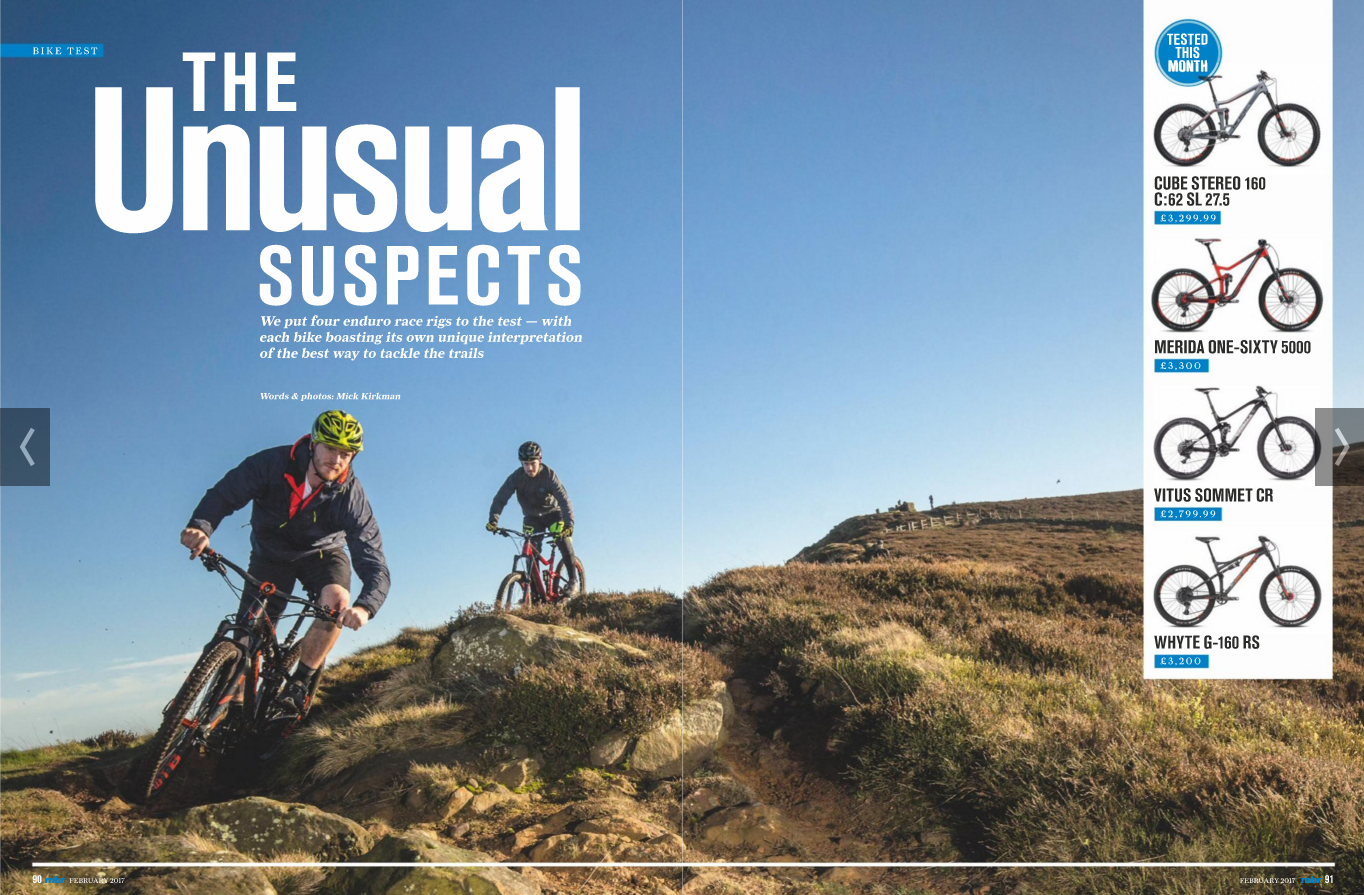 We put four enduro race rigs to the test – with each bike boasting its own unique interpretation of the way to tackle the trails. Cube Stereo 160 C:62 SL 27.5, Merida One-Sixty 5000, Vitus Sommet CR and Whyte G-160 RS.