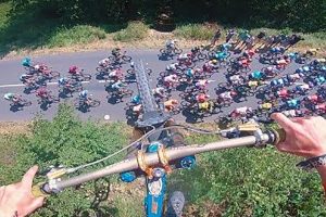 Watch from classic POV angle as a mountain biker gap jumps over the Tour de France peloton during Stage 10 of the 2018 Tour de France.