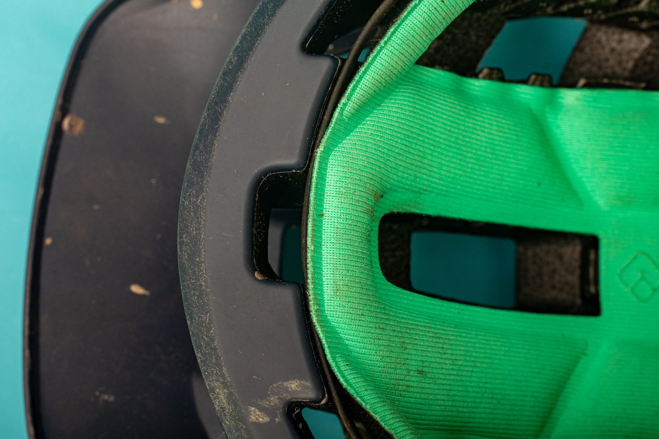 The Coyote’s outer shell has big vents and exhaust ports, including 3 large holes just above the brow. This forehead zone is critical for cooling, and the triple vents are also cut away on the inside to help channel air and aid heat management when working hard. Lazer’s minty green internal padding is thick and the Coyote uses a really broad padded panel that covers most of the crown of the head towards the front of the helmet.