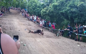 The race was held up as an ambulance had to be called to get Brayton off the hill. In the meantime a boozed up Aussie decided to take Brayton’s bike and ride it down the track to return it to the pits, but we suspect it was to entertain the crowd as well.